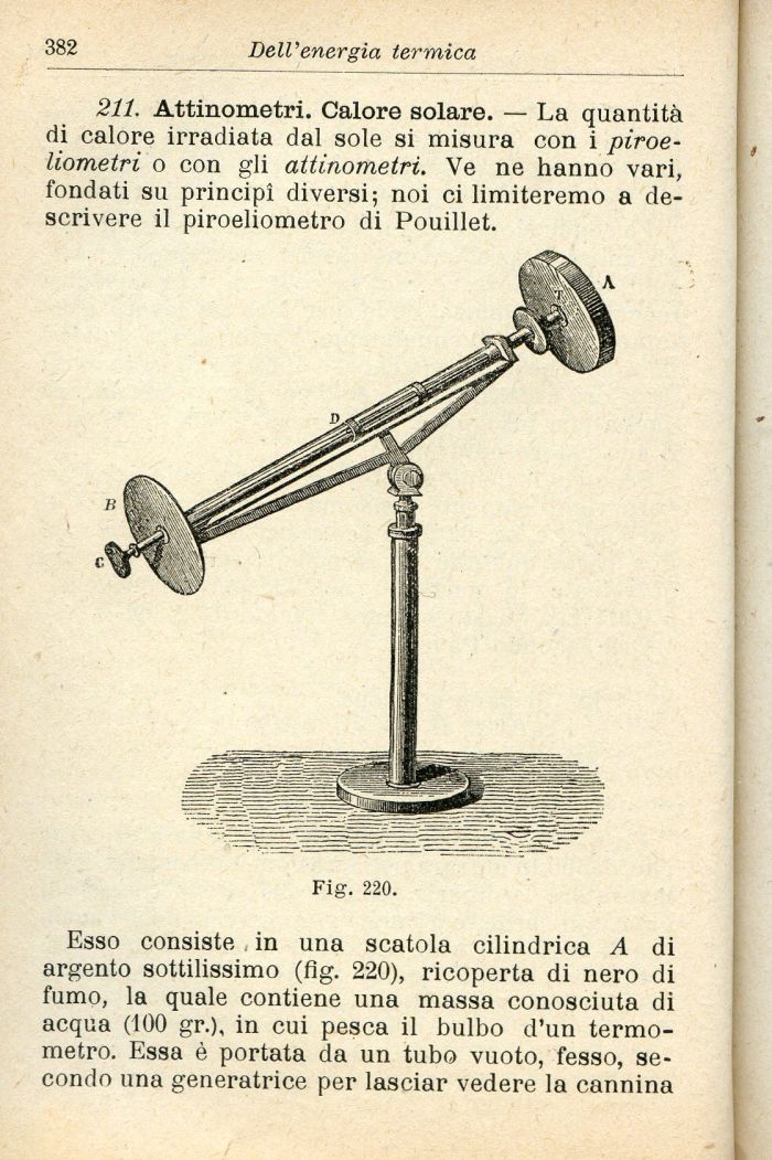 211. Attinometri. Calore solare. — La quantità di calore irradiata dal sole si misura con i piroeliometri o con gli attinometri. Ve ne hanno vari, fondati su principi diversi; noi ci limiteremo a descrivere il piroeliometro di Pouillet.
