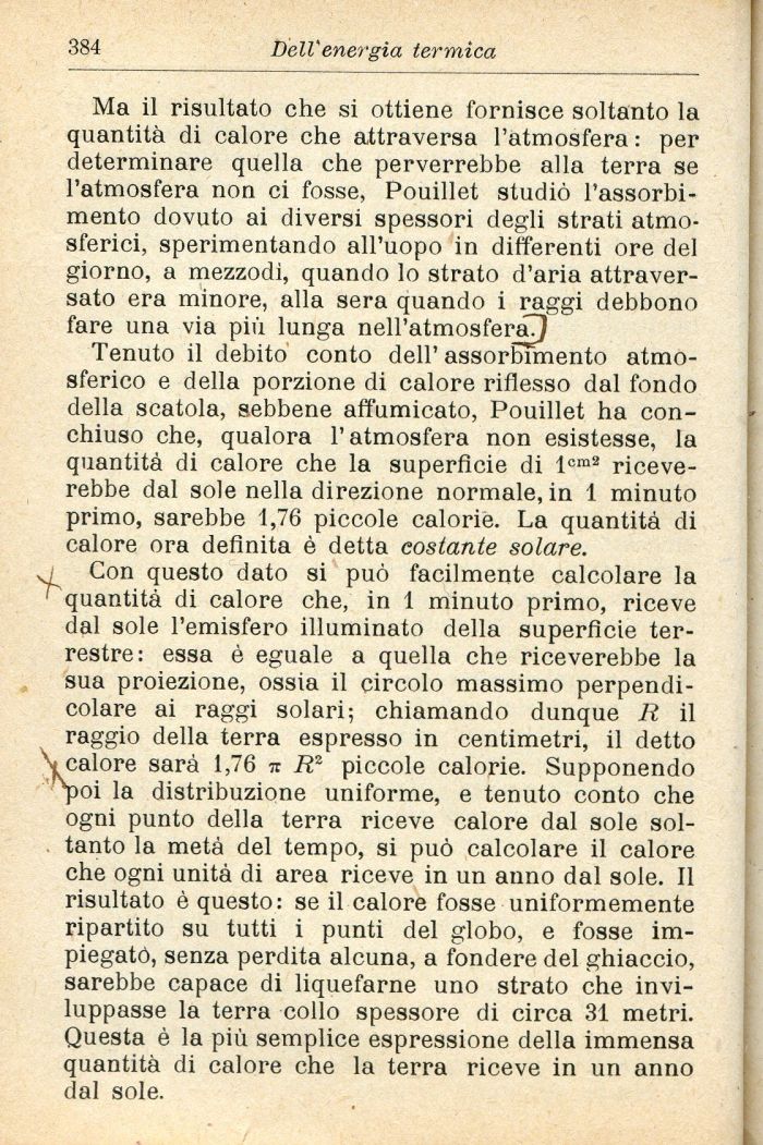 Tenuto il debito conto dell' assorbimento atmosferico e della porzione di calore riflesso dal fondo della scatola, sebbene affumicato, Pouillet ha conchiuso che, qualora l'atmosfera non esistesse, la quantità di calore che la superfìcie di lcm2 riceverebbe dal sole nella direzione normale, in 1 minuto primo, sarebbe 1,76 piccole calorie. La quantità di calore ora definita è detta costante solare.
