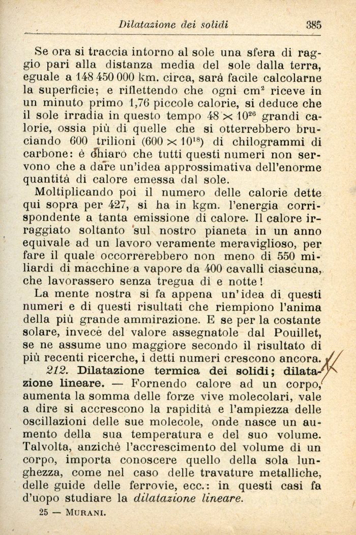 Moltiplicando poi il numero delle calorie dette qui sopra per 427, si ha in kgm. l'energia corrispondente a tanta emissione di calore. Il calore irraggiato soltanto sul nostro pianeta in un anno equivale ad un lavoro veramente meraviglioso, per fare il quale occorrerebbero non meno di 550 miliardi di macchine a vapore da 400 cavalli ciascuna, che lavorassero senza tregua di e notte !