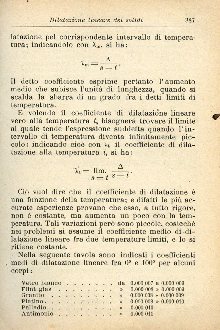 E volendo il coefficiente di dilatazione lineare vero alla temperatura t, bisognerà trovare il limite al quale tende l'espressione suddetta quando l'intervallo di temperatura diventa infinitamente piccolo : indicando cioè con xt il coefficiente di dilatazione alla temperatura t, si ha:
