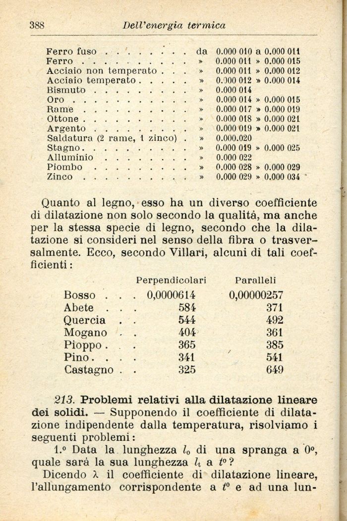 Quanto al legno, esso ha un diverso coefficiente di dilatazione non solo secondo la qualità, ma anche per la stessa specie di legno, secondo che la dilatazione si consideri nel senso della fibra o trasversalmente. Ecco, secondo Villari, alcuni di tali coef-