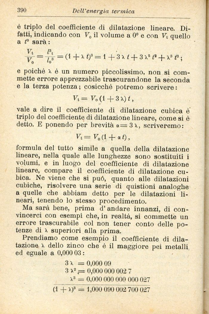 formula del tutto simile a quella della dilatazione lineare, nella quale alle lunghezze sono sostituiti i volumi, e in luogo del coefficiente di dilatazione lineare, compare il coefficiente di dilatazione cubica. Ne viene che si può, quanto alle dilatazioni cubiche, risolvere una serie di quistioni analoghe a quelle che abbiam detto per le dilatazioni lineari, tenendo lo stesso procedimento.