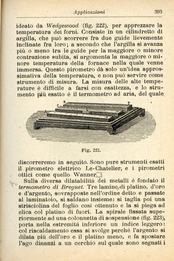 ideato da Wedgewood (fig. 222), per apprezzare la temperatura dei forni. Consiste in un cilindretto di argilla, che può scorrere fra due guide lievemente inclinate fra loro; a secondo che l'argilla si avanza più o meno tra le guide per la maggiore o minore contrazione subita, si argomenta la maggiore o minore temperatura della fornace nella quale venne immersa. Questo pirometro dà solo un'idea approssimativa della temperatura, e non può servire come strumento di misura. La misura delle alte temperature è diffìcile a farsi con esattezza, e lo strumento più esatto è il termometro ad aria, del quale