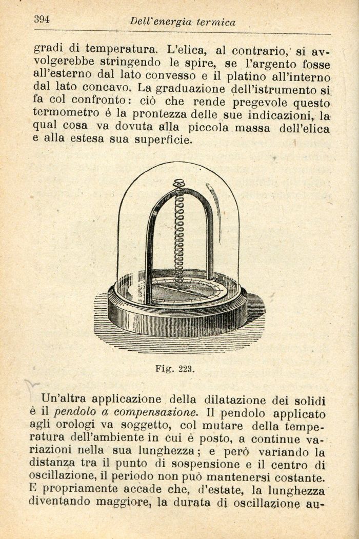 Un'altra applicazione della dilatazione dei solidi è il pendolo a compensazione. Il pendolo applicato agli orologi va soggetto, col mutare della temperatura dell'ambiente in cui è posto, a continue variazioni nella sua lunghezza ; e però variando la distanza tra il punto di sospensione e il centro di oscillazione, il periodo non può mantenersi costante. E propriamente accade che, d'estate, la lunghezza diventando maggiore, la durata di oscillazione au-