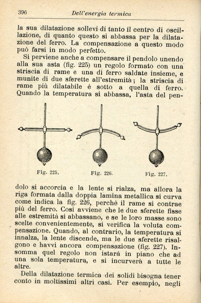 Si perviene anche a compensare il pendolo unendo alla sua asta (fig. 225) un regolo formato con una striscia di rame e una di ferro saldate insieme, e munite di due sferette all'estremità ; la striscia di rame più dilatabile è sotto a quella di ferro. Quando la temperatura si abbassa, l'asta del pen-