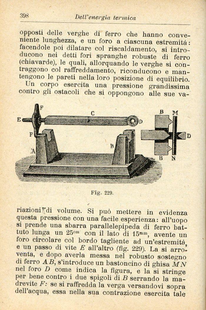 riazioni ,rdi volume. Si può mettere in evidenza questa pressione con una facile esperienza: all'uopo si prende una sbarra parallelepipeda di ferro battuto lunga un 25cm con il lato di 15mm, avente un foro circolare col bordo tagliente ad un'estremità, e un passo di vite E all'altro (fìg. 229). La si arroventa, e dopo averla messa nel robusto sostegno di ferro AB, s'introduce un bastoncino di ghisa MN nel foro D come indica la figura, e la si stringe per bene contro i due spigoli di B serrando la madrevite F: se si raffredda la verga versandovi sopra dell'acqua, essa nella sua contrazione esercita tale