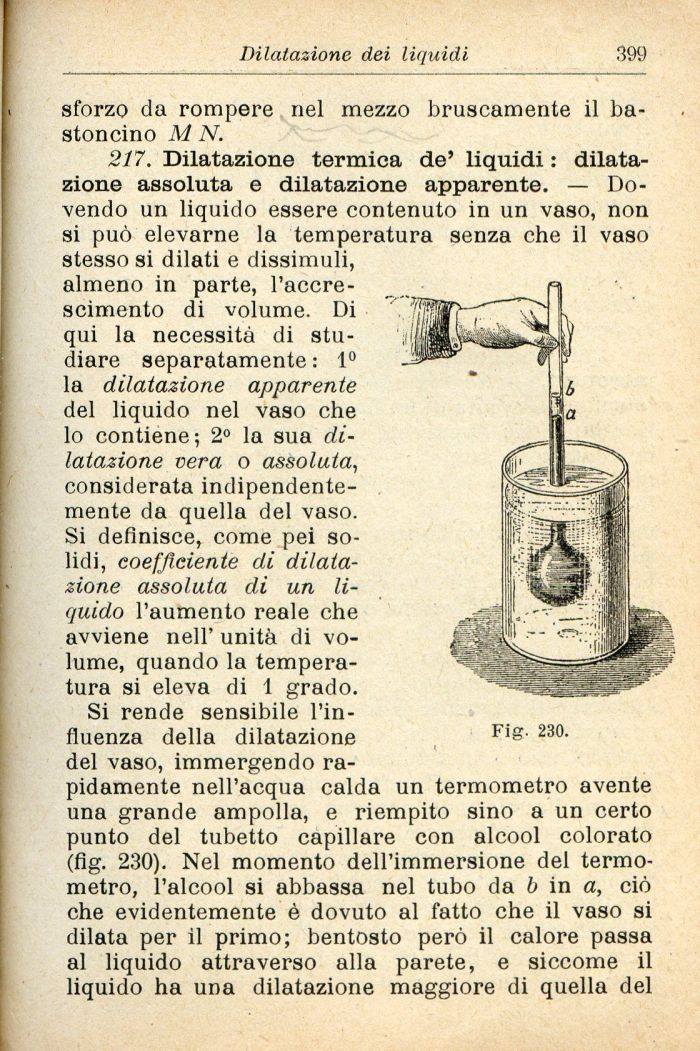 Si rende sensibile l'influenza della dilatazione Flg' 230-del vaso, immergendo rapidamente nell'acqua calda un termometro avente una grande ampolla, e riempito sino a un certo punto del tubetto capillare con alcool colorato (flg. 230). Nel momento dell'immersione del termometro, l'alcool si abbassa nel tubo da b in a, ciò che evidentemente è dovuto al fatto che il vaso si dilata per il primo; bentosto però il calore passa al liquido attraverso alla parete, e siccome il liquido ha una dilatazione maggiore di quella del