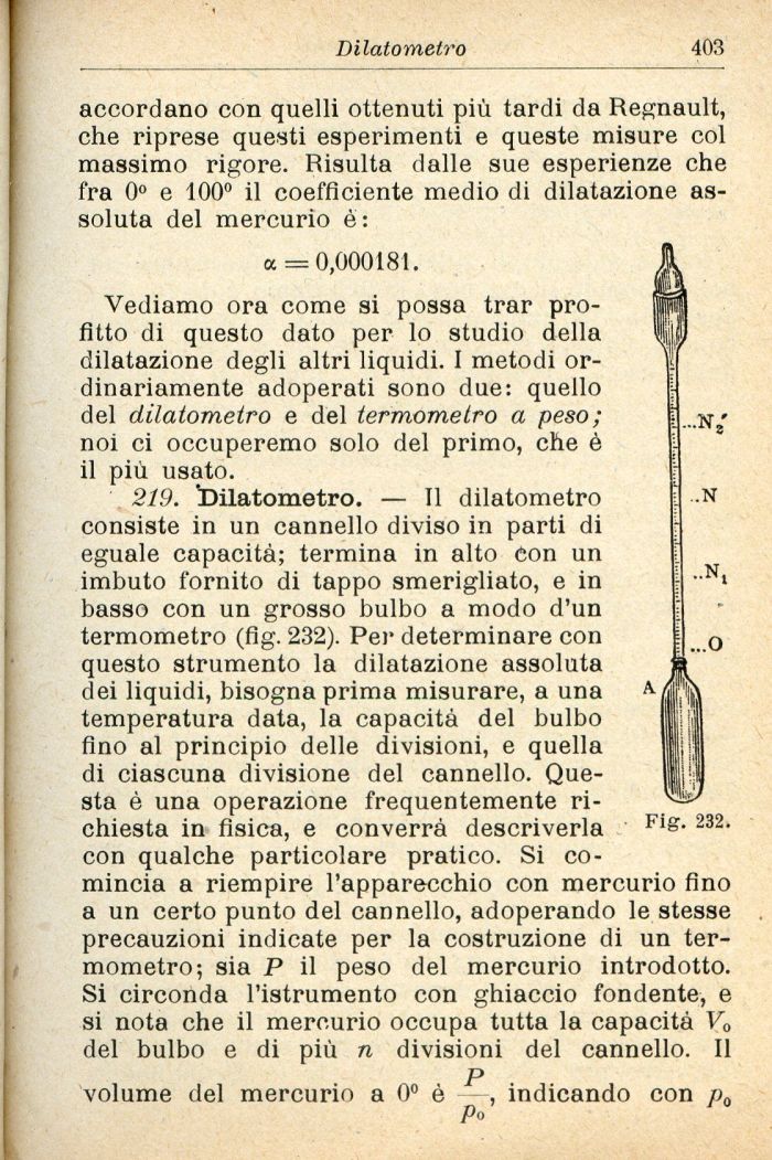 219. Dilatometro. — Il dilatometro consiste in un cannello diviso in parti di eguale capacità; termina in alto don un imbuto fornito di tappo smerigliato, e in basso con un grosso bulbo a modo d'un termometro (fig. 232). Pei' determinare con questo strumento la dilatazione assoluta dei liquidi, bisogna prima misurare, a una temperatura data, la capacità del bulbo fino al principio delle divisioni, e quella di ciascuna divisione del cannello. Questa è una operazione frequentemente richiesta in fisica, e converrà descriverla con qualche particolare pratico. Si comincia a riempire l'apparecchio con mercurio fino a un certo punto del cannello, adoperando le stesse precauzioni indicate per la costruzione di un termometro; sia p il peso del mercurio introdotto. Si circonda l'istrumento con ghiaccio fondente, e si nota che il mercurio occupa tutta la capacità V0