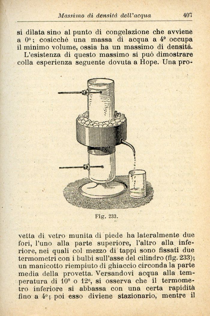 vetta di vetro munita di piede ha lateralmente due fori, l'uno alla parte superiore, l'altro alla inferiore, nei quali col mezzo di tappi sono fissati due termometri con i bulbi sull'asse del cilindro (fig. 233); un manicotto riempiuto di ghiaccio circonda la parte media della provetta. Versandovi acqua alla temperatura di 10° o 12°, si osserva che il termometro inferiore si abbassa con una certa rapidità fino a 4°; poi esso diviene stazionario, mentre il