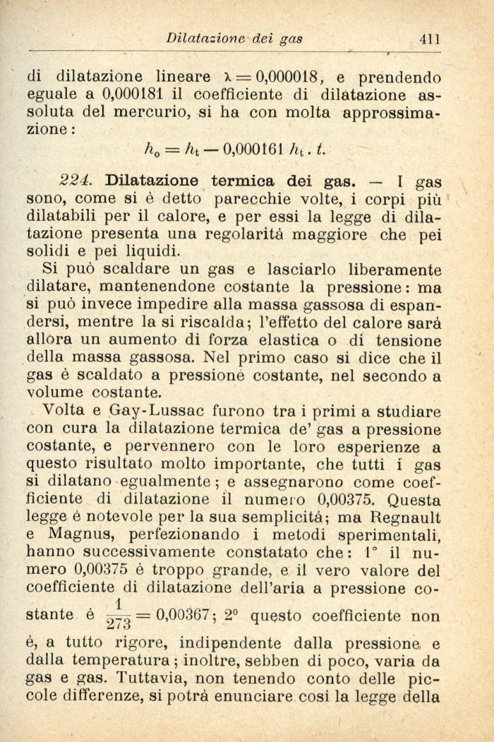 Volta e Gay-Lussac furono tra i primi a studiare con cura la dilatazione termica de' gas a pressione costante, e pervennero con le loro esperienze a questo risultato molto importante, che tutti i gas si dilatano egualmente ; e assegnarono come coefficiente di dilatazione il numero 0,00375. Questa legge è notevole per la sua semplicità; ma Regnault e Magnus, perfezionando i metodi sperimentali, hanno successivamente constatato che: 1° il numero 0,00375 è troppo grande, e il vero valore del coefficiente di dilatazione dell'aria a pressione costante è t * = 0,00367 ; 2° questo coefficiente non