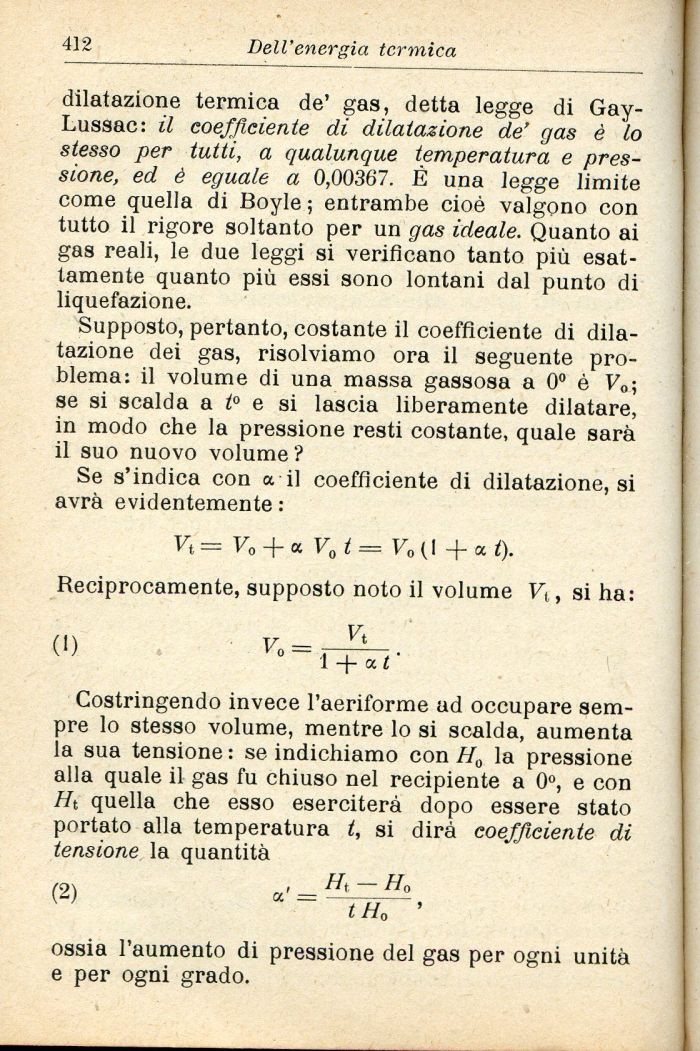 dilatazione termica de' gas, detta legge di Gay-Lussac: il coefficiente di dilatazione de' gas è lo stesso per tutti, a qualunque temperatura e pressione, ed è eguale a 0,00367. É una legge limite come quella di Boyle ; entrambe cioè valgono con tutto il rigore soltanto per un gas ideale. Quanto ai gas reali, le due leggi si verificano tanto più esattamente quanto più essi sono lontani dal punto di liquefazione.