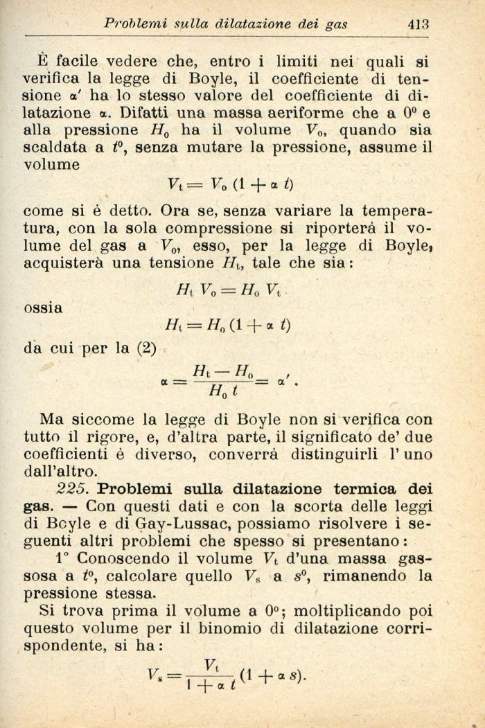 225. Problemi sulla dilatazione termica dei gas. — Con questi dati e con la scorta delle leggi di Boyle e di Gay-Lussac, possiamo risolvere i seguenti altri problemi che spesso si presentano :