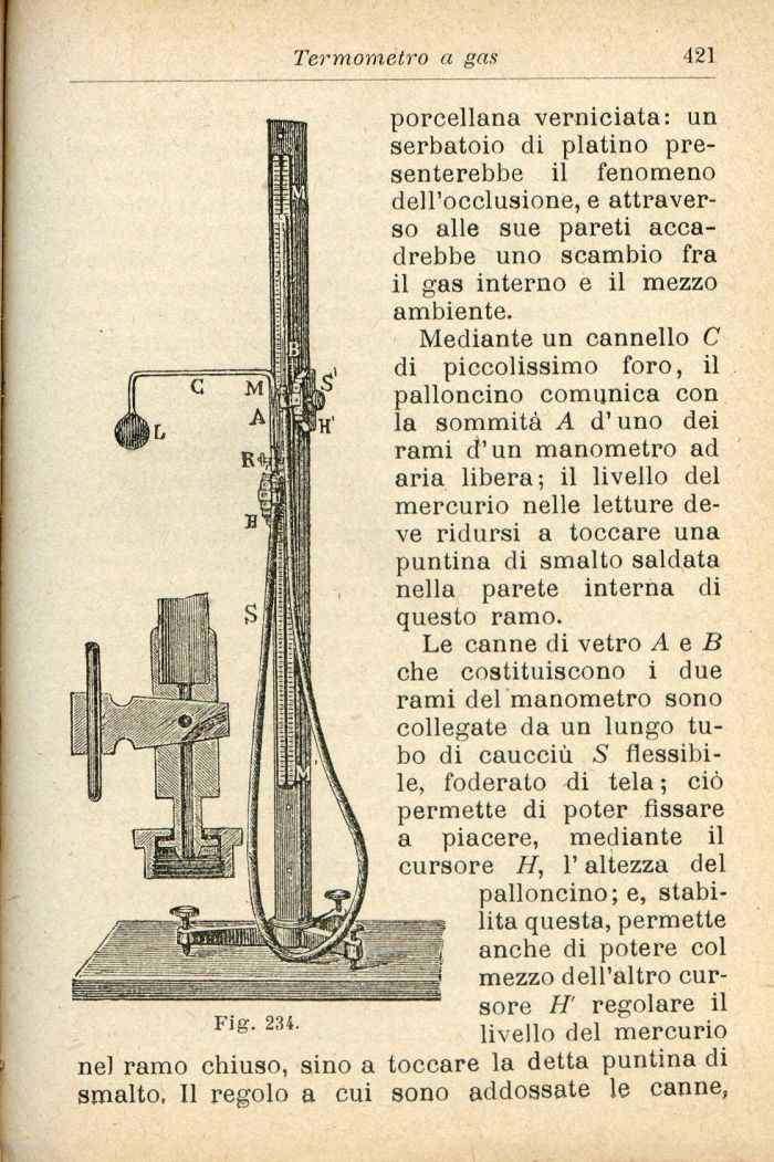 Mediante un cannello C di piccolissimo foro, il palloncino comunica con la sommità A d'uno dei rami d'un manometro ad aria libera; il livello del mercurio nelle letture deve ridursi a toccare una puntina di smalto saldata nella parete interna di questo ramo.