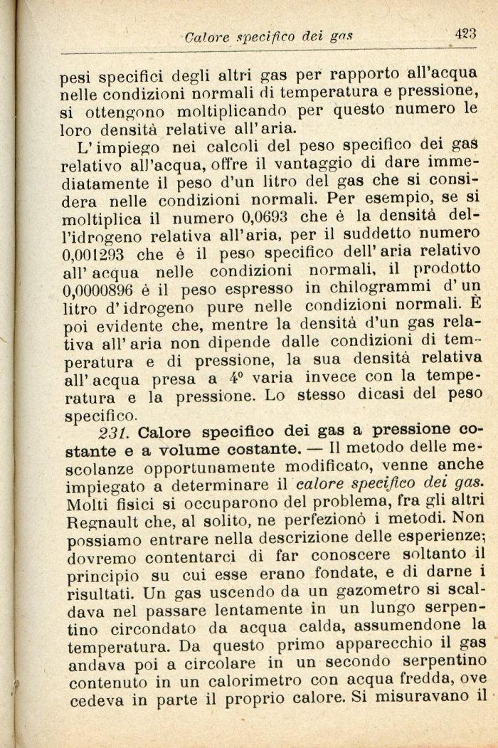 L'impiego nei calcoli del peso specifico dei gas relativo all'acqua, offre il vantaggio di dare immediatamente il peso d'un litro del gas che si considera nelle condizioni normali. Per esempio, se si moltiplica il numero 0,0693 che è la densità dell'idrogeno relativa all'aria, per il suddetto numero 0,001293 che è il peso specifico dell'aria relativo all' acqua nelle condizioni normali, il prodotto 0,0000896 è il peso espresso in chilogrammi d'un litro d'idrogeno pure nelle condizioni normali. È poi evidente che, mentre la densità d'un gas relativa all' aria non dipende dalle condizioni di tem peratura e di pressione, la sua densità relativa all'acqua presa a 4° varia invece con la temperatura e la pressione. Lo stesso dicasi del peso specifico.