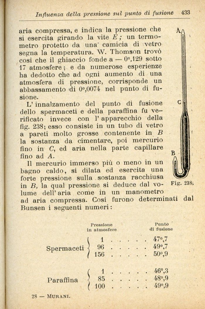 L' innalzamento del punto di fusione C dello spermaceti e della paraffina fu ve- Il rificato invece con 1* apparecchio della a fìg. 238; esso consiste in un tubo di vetro a pareti molto grosse contenente in B I < la sostanza da cimentare, poi mercurio I fino in C, ed aria nella parte capillare I Ano ad A. ® 1
