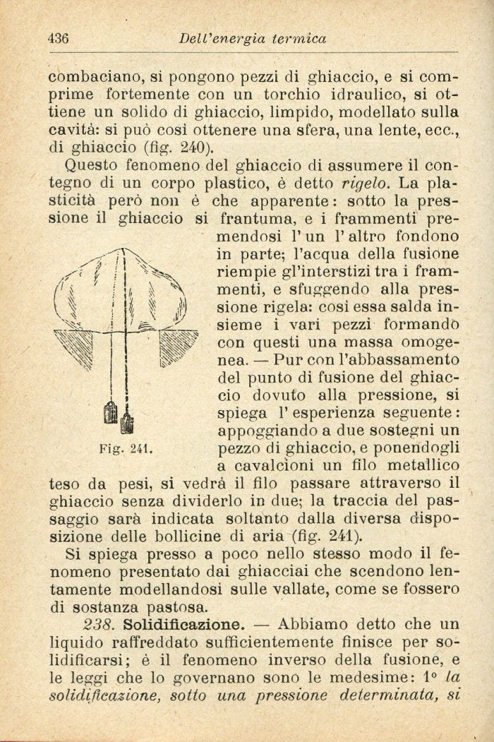 Questo fenomeno del ghiaccio di assumere il contegno di un corpo plastico, è detto rigelo. La plasticità però non è che apparente : sotto la pressione il ghiaccio si frantuma, e i frammenti premendosi 1' un 1' altro fondono in parte; l'acqua della fusione riempie gl'interstizi tra i frammenti, e sfuggendo alla pressione rigela: così essa salda insieme i vari pezzi formando con questi una massa omogenea. — Pur con l'abbassamento del punto di fusione del ghiaccio dovuto alla pressione, si spiega 1' esperienza seguente : appoggiando a due sostegni un pezzo di ghiaccio, e ponendogli a cavalcioni un filo metallico teso da pesi, si vedrà il filo passare attraverso il ghiaccio senza dividerlo in due; la traccia del passaggio sarà indicata soltanto dalla diversa disposizione delle bollicine di aria (fig. 241).