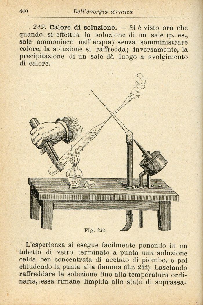 242. Calore di soluzione. — Si è visto ora che quando si effettua la soluzione di un sale (p. es., sale ammoniaco nell'acqua) senza somministrare calore, la soluzione si raffredda; inversamente, la precipitazione di un sale dà luogo a svolgimento di calore.