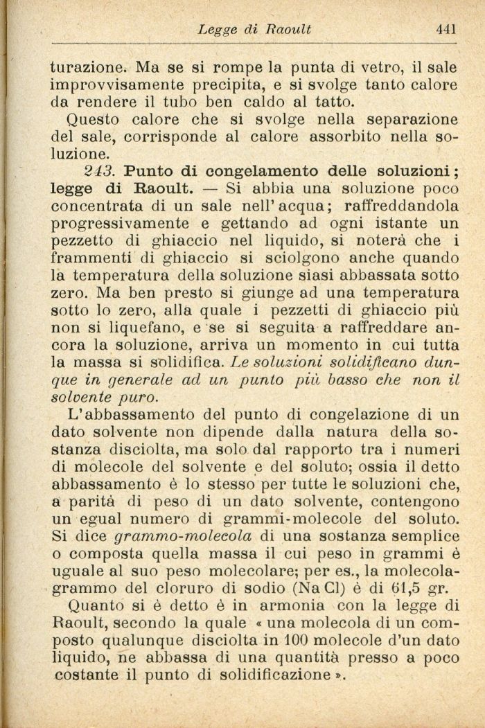 L'abbassamento del punto di congelazione di un dato solvente non dipende dalla natura della sostanza disciolta, ma solo dal rapporto tra i numeri di molecole del solvente e del soluto; ossia il detto abbassamento è lo stesso per tutte le soluzioni che, a parità di peso di un dato solvente, contengono un egual numero di grammi-molecole del soluto. Si dice grammo-molecola di una sostanza semplice o composta quella massa il cui peso in grammi è uguale al suo peso molecolare; per es., la molecola-grammo del cloruro di sodio (Na CI) è di 61,5 gr.