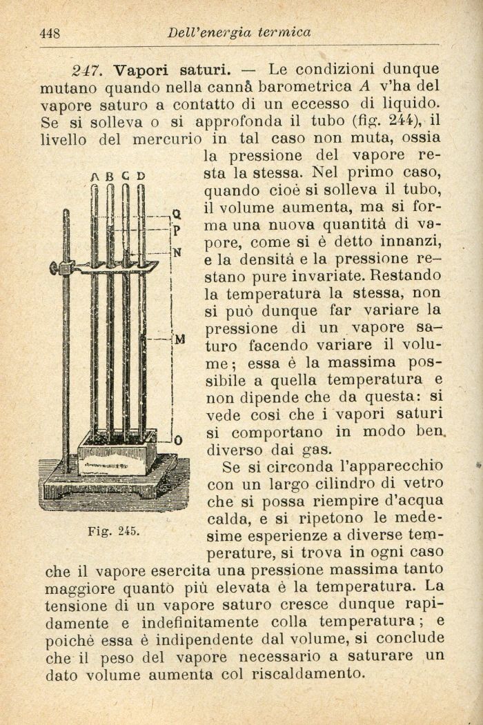 247. Vapori saturi. — Le condizioni dunque mutano quando nella cannà barometrica A v'ha del vapore saturo a contatto di un eccesso di liquido. Se si solleva o si approfonda il tubo (fig-. 244), il livello del mercurio in tal caso non muta, ossia la pressione del vapore resta la stessa. Nel primo caso, quando cioè si solleva il tubo, il volume aumenta, ma si forma una nuova quantità di vapore, come si è detto innanzi, e la densità e la pressione restano pure invariate. Restando la temperatura la stessa, non si può dunque far variare la pressione di un vapore sa^ turo facendo variare il volume ; essa è la massima possibile a quella temperatura e non dipende che da questa: si vede cosi che i vapori saturi si comportano in modo ben. diverso dai gas.