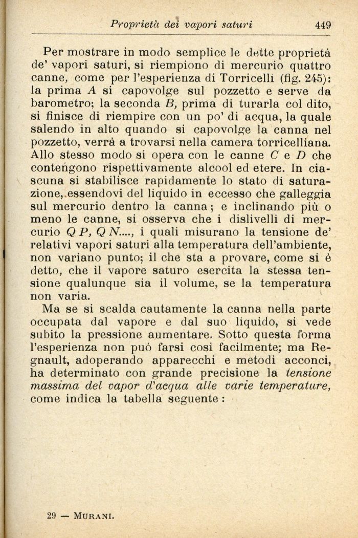 Ma se si scalda cautamente la canna nella parte occupata dal vapore e dal suo liquido, si vede subito la pressione aumentare. Sotto questa forma l'esperienza non può farsi così facilmente; ma Re-gnault, adoperando apparecchi e metodi acconci, ha determinato con grande precisione la tensione massima del vapor d'acqua alle varie temperature, come indica la tabella seguente :