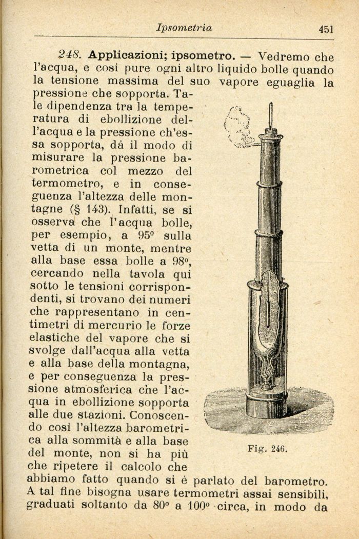 248. Applicazioni; ipsometro. — Vedremo che l'acqua, e cosi pure ogni altro liquido bolle quando la tensione massima del suo vapore eguaglia la pressione che sopporta. Tale dipendenza tra la temperatura di ebollizione dell'acqua e la pressione ch'essa sopporta, dà il modo di misurare la pressione barometrica col mezzo del termometro, e in conseguenza l'altezza delle montagne (§ 143). Infatti, se si osserva che l'acqua bolle, per esempio, a 95° sulla vetta di un monte, mentre alla base essa bolle a 98°, cercando nella tavola qui sotto le tensioni corrispondenti, si trovano dei numeri che rappresentano in centimetri di mercurio le forze elastiche del vapore che si svolge dall'acqua alla vetta e alla base della montagna, e per conseguenza la pressione atmosferica che l'acqua in ebollizione sopporta alle due stazioni. Conoscendo così l'altezza barometrica alla sommità e alla base del monte, non si ha più che ripetere il calcolo che abbiamo fatto quando si è parlato del barometro. A tal fine bisogna usare termometri assai sensibili, graduati soltanto da 80° a 100° circa, in modo da