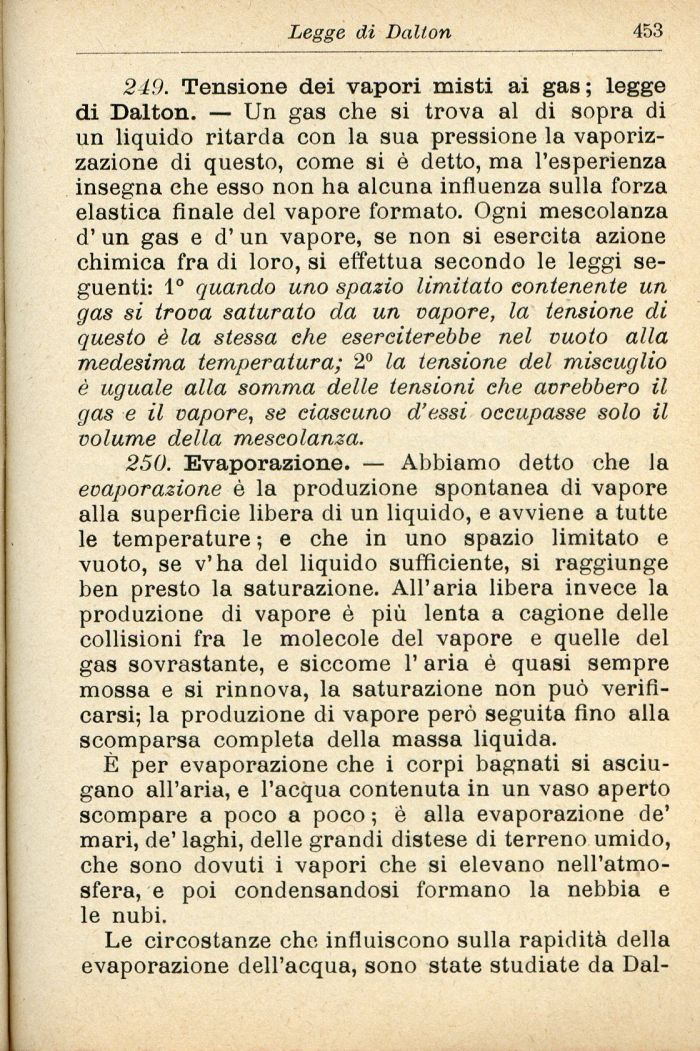 È per evaporazione che i corpi bagnati si asciugano all'aria, e l'acqua contenuta in un vaso aperto scompare a poco a poco ; è alla evaporazione de' mari, de' laghi, delle grandi distese di terreno umido, che sono dovuti i vapori che si elevano nell'atmosfera, e poi condensandosi formano la nebbia e le nubi.