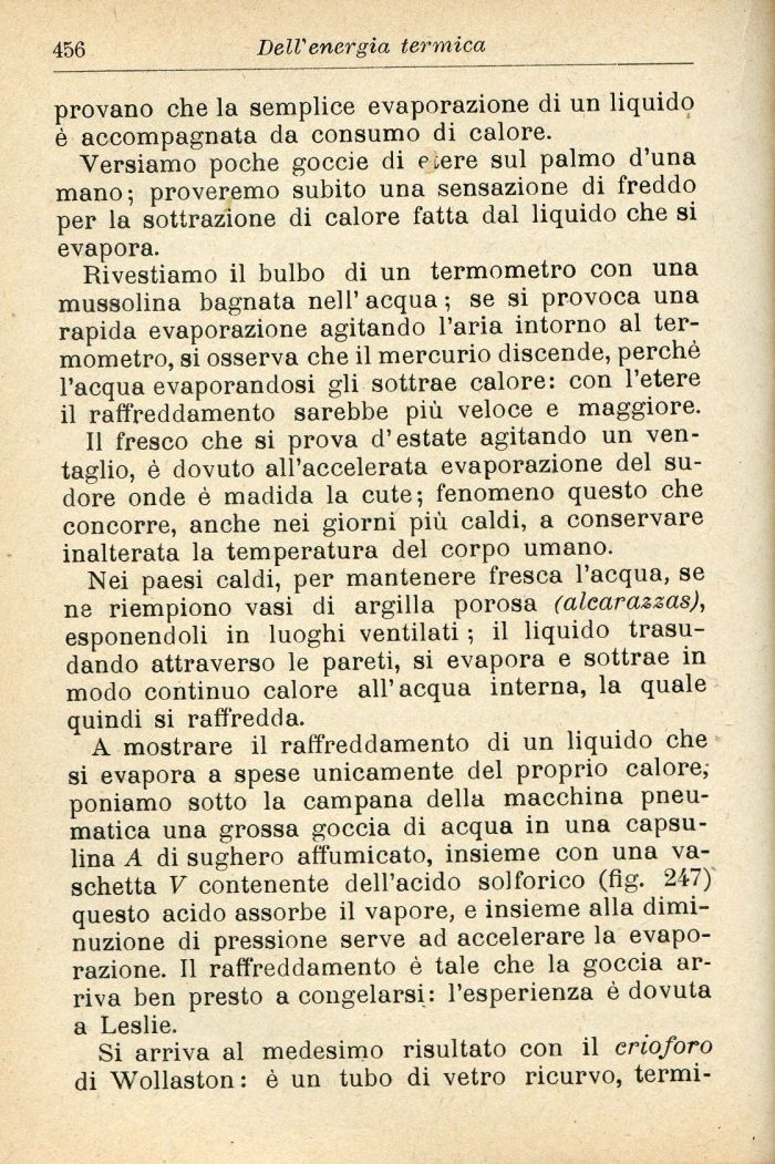 A mostrare il raffreddamento di un liquido che si evapora a spese unicamente del proprio calore; poniamo sotto la campana della macchina pneumatica una grossa goccia di acqua in una capsu-lina A di sughero affumicato, insieme con una vaschetta V contenente dell'acido solforico (fig. 247) questo acido assorbe il vapore, e insieme alla diminuzione di pressione serve ad accelerare la evaporazione. Il raffreddamento è tale che la goccia arriva ben presto a congelarsi: l'esperienza è dovuta a Leslie.
