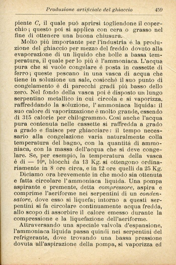 Molto più importante per l'industria è la produzione del ghiaccio per mezzo del freddo dovuto alla evaporazione di un liquido che bolle a bassa temperatura, il quale per lo più è l'ammoniaca. L'acqua pura che si vuole congelare è posta in cassette di ferro ; queste pescano in una vasca di acqua che tiene in soluzione un sale, cosicché il suo punto di congelamento è di parecchi gradi più basso dello zero. Nel fondo della vasca poi è disposto un lungo serpentino metallico in cui circola e si vaporizza, raffreddando la soluzione, 1' ammoniaca liquida: il suo calore di vaporizzazione è molto grande, essendo di 315 calorie per chilogrammo. Cosi anche l'acqua pura contenuta nelle cassette si raffredda a grado a grado e finisce per ghiacciare: il tempo necessario alla congelazione varia naturalmente colla temperatura del bagno, con la quantità di ammoniaca, con la massa dell'acqua che si deve congelare. Se, per esempio, la temperatura della vasca è di — 10°, blocchi da 13 Kg. si ottengono ordinariamente in 8 ore circa, e in 12 ore quelli da 25 Kg.