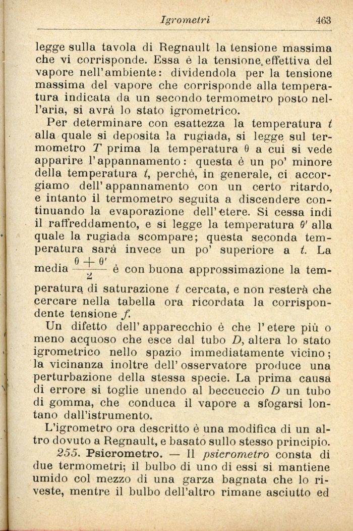 legge sulla tavola di Regnault la tensione massima che vi corrisponde. Essa è la tensione.effettiva del vapore nell'ambiente: dividendola per la tensione massima del vapore che corrisponde alla temperatura indicata da un secondo termometro posto nell'aria, si avrà lo stato igrometrico.