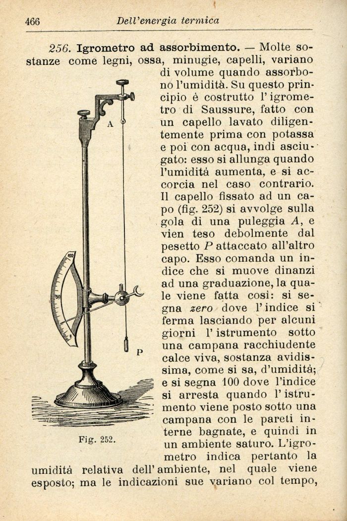256. Igrometro ad assorbimento. — Molte sostanze come legni, ossa, minugie, capelli, variano di volume quando assorbono l'umidità. Su questo principio è costrutto l'igrometro di Saussure, fatto con un capello lavato diligentemente prima con potassa e poi con acqua, indi asciugato: esso si allunga quando l'umidità aumenta, e si accorcia nel caso contrario. Il capello fissato ad un capo (fig. 252) si avvolge sulla gola di una puleggia A, e vien teso debolmente dal pesetto P attaccato all'altro capo. Esso comanda un indice che si muove dinanzi ad una graduazione, la quale viene fatta cosi: si segna zero dove l'indice si ferma lasciando per alcuni giorni l'istrumento sotto una campana racchiudente calce viva, sostanza avidissima, come si sa, d'umidità; e si segna 100 dove l'indice si arresta quando l'istrumento viene posto sotto una campana con le pareti interne bagnate, e quindi in un ambiente saturo. L'igrometro indica pertanto la umidità relativa dell' ambiente, nel quale viene esposto; ma le indicazioni sue variano col tempo,