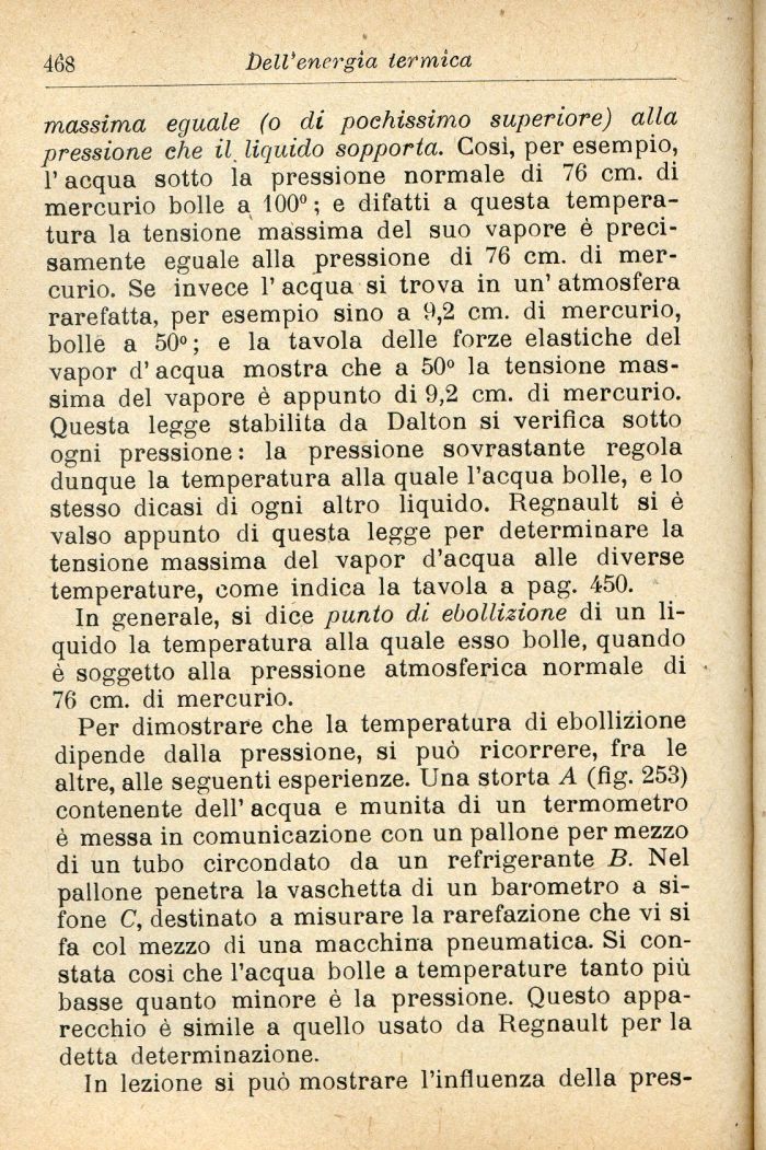 massima eguale (o di pochissimo superiore) alla pressione che il liquido sopporta. Così, per esempio, l'acqua sotto la pressione normale di 76 cm. di mercurio bolle a 100°; e difatti a questa temperatura la tensione massima del suo vapore è precisamente eguale alla pressione di 76 cm. di mercurio. Se invece 1' acqua si trova in un' atmosfera rarefatta, per esempio sino a 9,2 cm. di mercurio, bolle a 50°; e la tavola delle forze elastiche del vapor d'acqua mostra che a 50° la tensione massima del vapore è appunto di 9,2 cm. di mercurio. Questa legge stabilita da Dalton si verifica sotto ogni pressione : la pressione sovrastante regola dunque la temperatura alla quale l'acqua bolle, e lo stesso dicasi di ogni altro liquido. Regnault si è valso appunto di questa legge per determinare la tensione massima del vapor d'acqua alle diverse temperature, come indica la tavola a pag. 450.