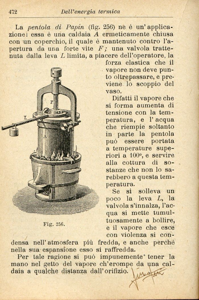 La pentola di Papin (fig. 256) ne è un' applicazione: essa è una caldaia A ermeticamente chiusa con un coperchio, il quale è mantenuto contro l'apertura da una forte vite F; una valvola trattenuta dalla leva L limita, a piacere dell'operatore, la