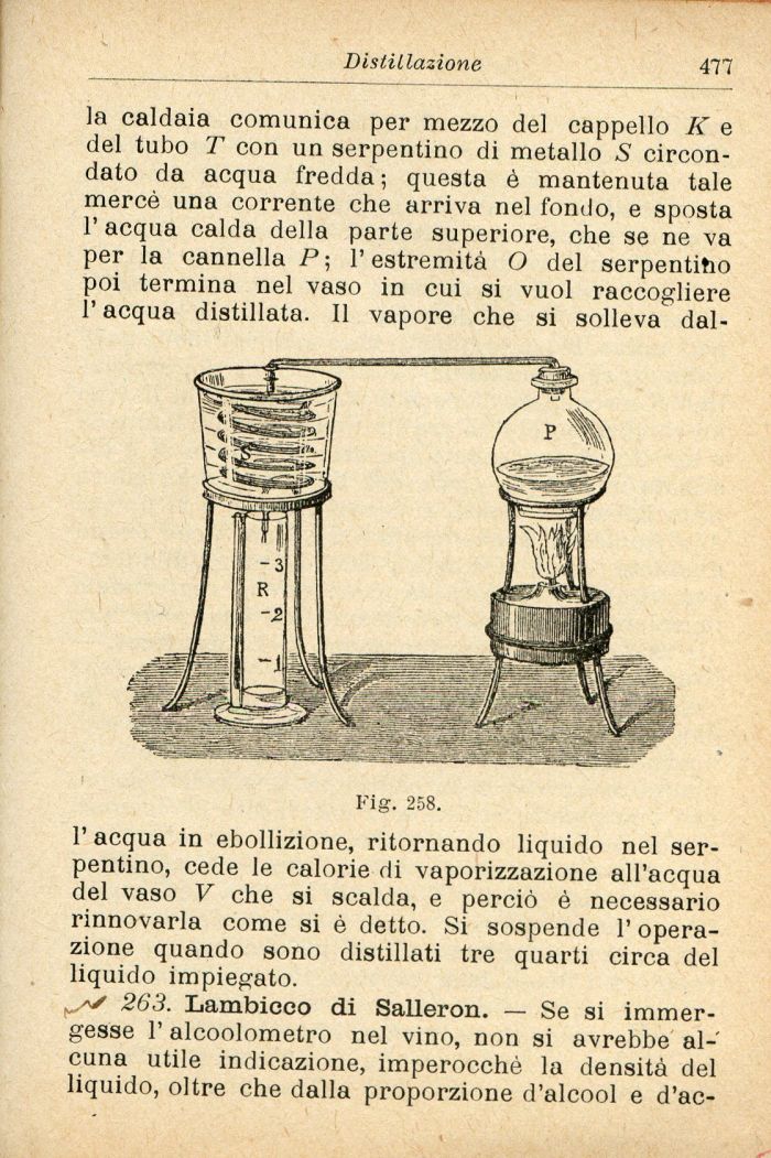 263. Lambicco di Salleron. — Se si immergesse 1' aleoolometro nel vino, non si avrebbe alcuna utile indicazione, imperocché la densità del liquido, oltre che dalla proporzione d'alcool e d'ac-