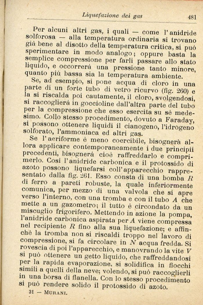 Se, ad esempio, si pone acqua di cloro in una parte di un forte tubo di vetro ricurvo (fig. 260) e la si riscalda poi cautamente, il cloro, svolgendosi, si raccoglierà in goccioline dall'altra parte del tubo per la compressione che esso esercita su sé medesimo. Collo stesso procedimento, dovuto a Faraday, si possono ottenere liquidi il cianogeno, l'idrogeno solforato, l'ammoniaca ed altri gas.