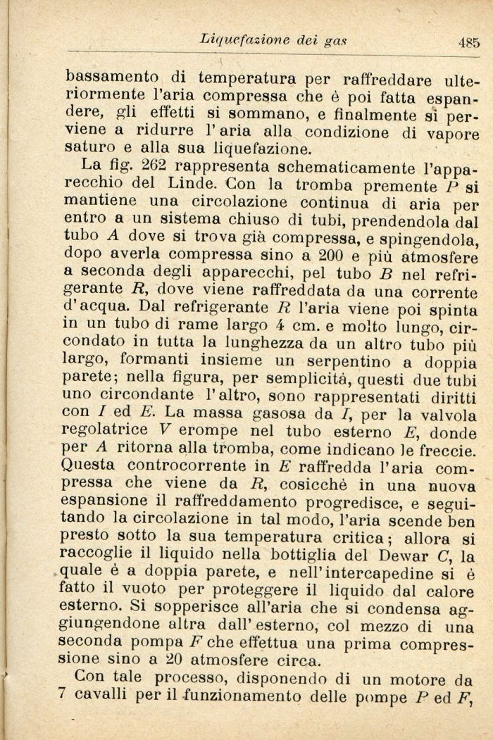 La fig. 262 rappresenta schematicamente l'apparecchio del Linde. Con la tromba premente P si mantiene una circolazione continua di aria per entro a un sistema chiuso di tubi, prendendola dal tubo A dove si trova già compressa, e spingendola, dopo averla compressa sino a 200 e più atmosfere a seconda degli apparecchi, pel tubo B nel refrigerante R, dove viene raffreddata da una corrente d'acqua. Dal refrigerante R l'aria viene poi spinta in un tubo di rame largo 4 cm. e molto lungo, circondato in tutta la lunghezza da un altro tubo più largo, formanti insieme un serpentino a doppia parete; nella figura, per semplicità, questi due tubi uno circondante l'altro, sono rappresentati diritti con / ed E. La massa gasosa da /, per la valvola regolatrice V erompe nel tubo esterno E, donde per A ritorna alla tromba, come indicano le freccie. Questa controcorrente in E raffredda l'aria compressa che viene da R, cosicché in una nuova espansione il raffreddamento progredisce, e seguitando la circolazione in tal modo, l'aria scende ben presto sotto la sua temperatura critica ; allora si raccoglie il liquido nella bottiglia del Dewar C, la quale è a doppia parete, e nell'intercapedine si è fatto il vuoto per proteggere il liquido dal calore esterno. Si sopperisce all'aria che si condensa aggiungendone altra dall' esterno, col mezzo di una seconda pompai^ che effettua una prima compressione sino a 20 atmosfere circa.