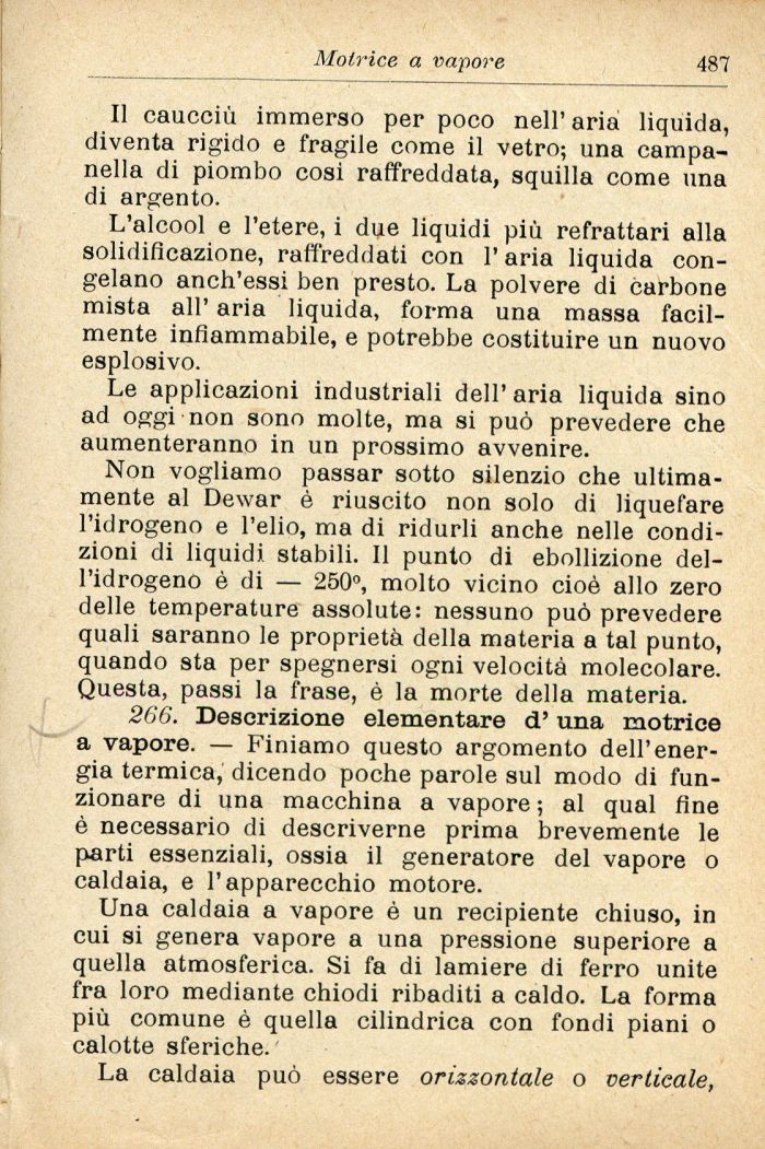 Non vogliamo passar sotto silenzio che ultimamente al Dewar è riuscito non solo di liquefare l'idrogeno e l'elio, ma di ridurli anche nelle condizioni di liquidi stabili. Il punto di ebollizione dell'idrogeno è di — 250°, molto vicino cioè allo zero delle temperature assolute: nessuno può prevedere quali saranno le proprietà della materia a tal punto, quando sta per spegnersi ogni velocità molecolare. Questa, passi la frase, è la morte della materia.