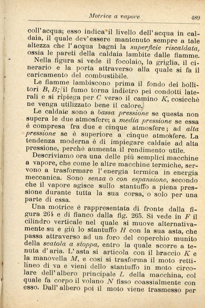 Descriviamo ora una delle più semplici macchine a vapore, che come le altre macchine termiche, servono a trasformare l'energia termica in energia meccanica. Sono senza o con espansione, secondo che il vapore agisce sullo stantuffo a piena pressione durante tutta la sua corsa, o solo per una parte di essa.