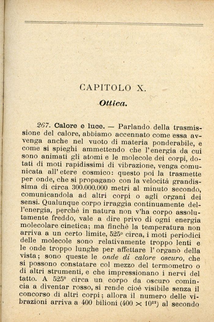 267. Calore e luce. — Parlando della trasmissione del calore, abbiamo accennato come essa avvenga anche nel vuoto di materia ponderabile, e come si spieghi ammettendo che l'energia da cui sono animati gli atomi e le molecole dei corpi, dotati di moti rapidissimi di vibrazione, venga comunicata all'etere cosmico: questo poi la trasmette per onde, che si propagano con la velocità grandissima di circa 300.000.000 metri al minuto secondo, comunicandola ad altri corpi o agli organi dei sensi. Qualunque corpo irraggia continuamente dell'energia, perchè in natura non v'ha corpo assolutamente freddo, vale a dire privo di ogni energia molecolare cinetica; ma finché la temperatura non arriva a un certo limite, 525° circa, i moti periodici delle molecole sono relativamente troppo lenti e le onde troppo lunghe per affettare 1' organo della vista ; sono queste le onde di calore oscuro, che si possono constatare col mezzo del termometro o di altri strumenti, e che impressionano i nervi del tatto. A 525° circa un corpo da oscuro comincia a diventar rosso, si rende cioè visibile senza il concorso di altri corpi ; allora il numero delle vibrazioni arriva a 400 bilioni (400 x IO12) al secondo