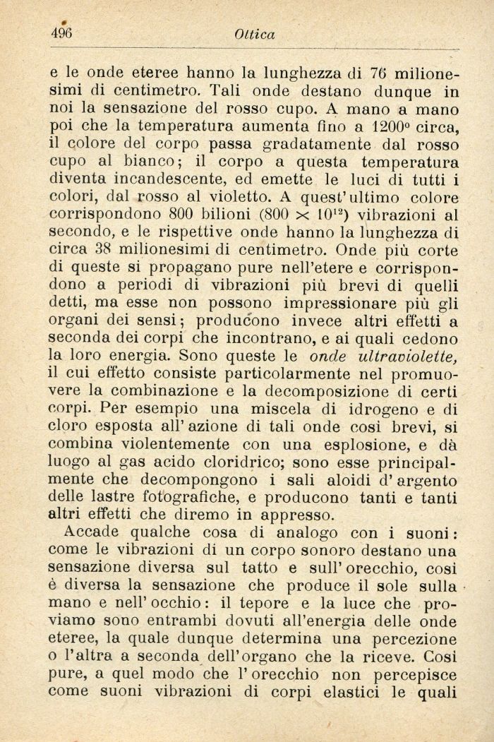 e le onde eteree hanno la lunghezza di 7G milionesimi di centimetro. Tali onde destano dunque in noi la sensazione del rosso cupo. A mano a mano poi che la temperatura aumenta fino a 1200° circa, il colore del corpo passa gradatamente dal rosso cupo al bianco; il corpo a questa temperatura diventa incandescente, ed emette le luci di tutti i colori, dal rosso al violetto. A quest'ultimo colore corrispondono 800 bilioni (800 x IO12) vibrazioni al secondo, e le rispettive onde hanno la lunghezza di circa 38 milionesimi di centimetro. Onde più corte di queste si propagano pure nell'etere e corrispondono a periodi di vibrazioni più brevi di quelli detti, ma esse non possono impressionare più gli organi dei sensi ; producono invece altri effetti a seconda dei corpi che incontrano, e ai quali cedono la loro energia. Sono queste le onde ultraviolette, il cui effetto consiste particolarmente nel promuovere la combinazione e la decomposizione di certi corpi. Per esempio una miscela di idrogeno e di cloro esposta all' azione di tali onde cosi brevi, si combina violentemente con una esplosione, e dà luogo al gas acido cloridrico; sono esse principalmente che decompongono i sali aloidi d'argento delle lastre fotografiche, e producono tanti e tanti altri effetti che diremo in appresso.