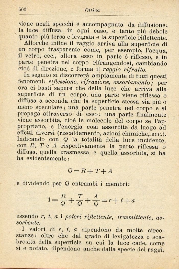 In seguito si discorrerà ampiamente di tutti questi fenomeni: riflessione, rifrazione, assorbimento; per ora ci basti sapere che della luce che arriva alla superfìcie di un corpo, una parte viene riflessa o diffusa a seconda che la superfìcie stessa sia più o meno speculare ; una parte penetra nel corpo e si propaga attraverso di esso ; una parte finalmente viene assorbita, cioè le molecole del corpo se l'appropriano, e l'energia cosi assorbita dà luogo ad effetti diversi (riscaldamento, azioni chimiche, ecc.). Indicando con q la totalità della luce incidente, con r, t e a rispettivamente la parte riflessa o diffusa, quella trasmessa e quella assorbita, si ha ha evidentemente :