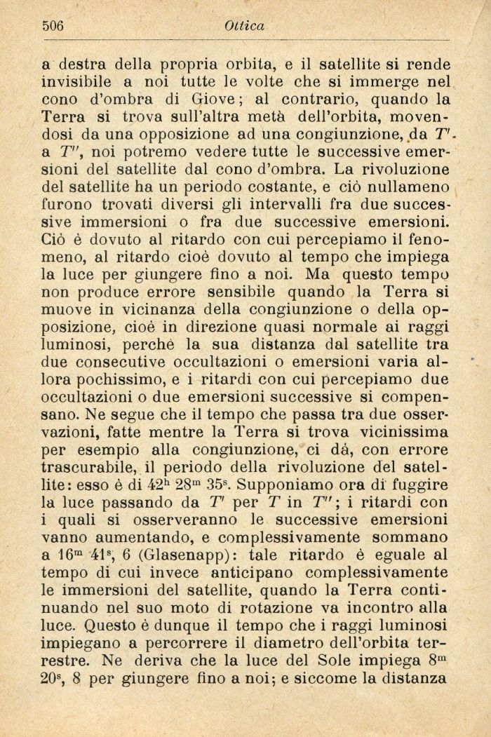 a destra della propria orbita, e il satellite si rende invisibile a noi tutte le volte che si immerge nel cono d'ombra di Giove ; al contrario, quando la Terra si trova sull'altra metà dell'orbita, movendosi da una opposizione ad una congiunzione, da T' a T, noi potremo vedere tutte le successive emersioni del satellite dal cono d'ombra. La rivoluzione del satellite ha un periodo costante, e ciò nullameno furono trovati diversi gli intervalli fra due successive immersioni o fra due successive emersioni. Ciò è dovuto al ritardo con cui percepiamo il fenomeno, al ritardo cioè dovuto al tempo che impiega la luce per giungere fino a noi. Ma questo tempo non produce errore sensibile quando la Terra si muove in vicinanza della congiunzione o della opposizione, cioè in direzione quasi normale ai raggi luminosi, perchè la sua distanza dal satellite tra due consecutive occultazioni o emersioni varia allora pochissimo, e i ritardi con cui percepiamo due occultazioni o due emersioni successive si compensano. Ne segue che il tempo che passa tra due osservazioni, fatte mentre la Terra si trova vicinissima per esempio alla congiunzione, ci dà, con errore trascurabile, il periodo della rivoluzione del satellite: esso è di 42h 28m 35s. Supponiamo ora di fuggire la luce passando da T per T in T ; i ritardi con i quali si osserveranno le successive emersioni vanno aumentando, e complessivamente sommano a 16m 41», 6 (Glasenapp): tale ritardo è eguale al tempo di cui invece anticipano complessivamente le immersioni del satellite, quando la Terra continuando nel suo moto di rotazione va incontro alla luce. Questo è dunque il tempo che i raggi luminosi impiegano a percorrere il diametro dell'orbita terrestre. Ne deriva che la luce del Sole impiega 8m 20s, 8 per giungere fino a noi; e siccome la distanza