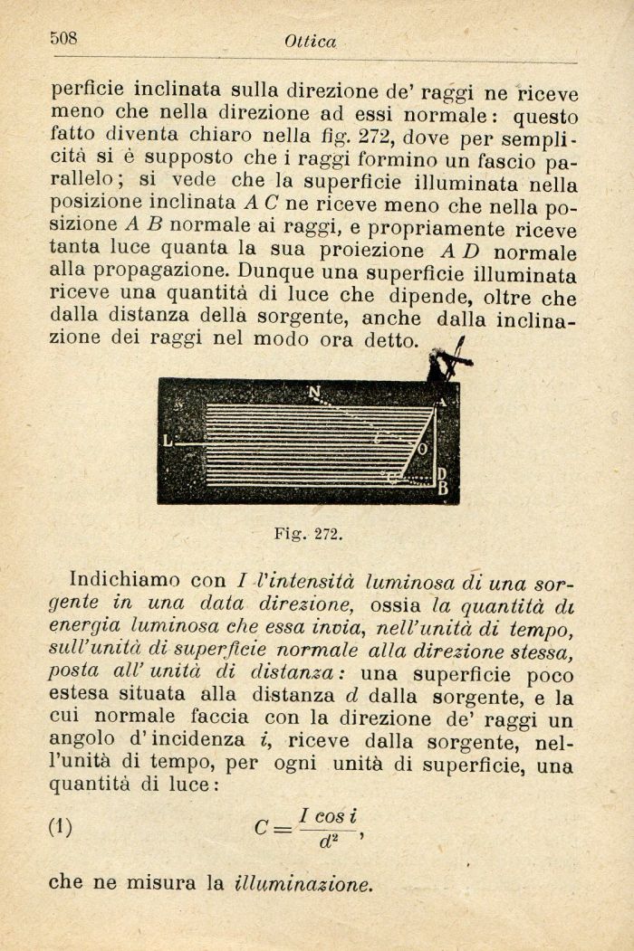 Indichiamo con I l'intensità luminosa di una sorgente in una data direzione, ossia la quantità di energia luminosa che essa invia, nell'unità di tempo, sull'unità di superficie normale alla direzione stessa, posta all'unità di distanza: una superficie poco estesa situata alla distanza d dalla sorgente, e la cui normale faccia con la direzione de' raggi un angolo d'incidenza i, riceve dalla sorgente, nell'unità di tempo, per ogni unità di superficie, una quantità di luce :