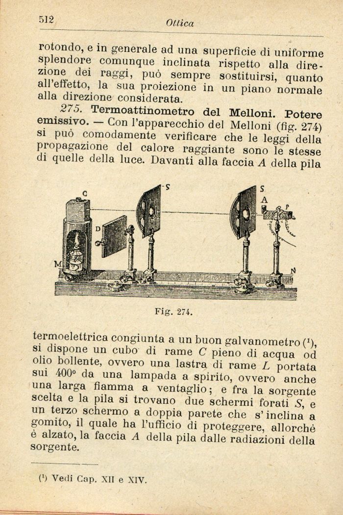 275. Termoattinometro del Melloni. Potere emissivo. — Con l'apparecchio del Melloni (fig. 274) si può comodamente verificare che le leggi della propagazione del calore raggiante sono le stesse di quelle della luce. Davanti alla faccia A della pila