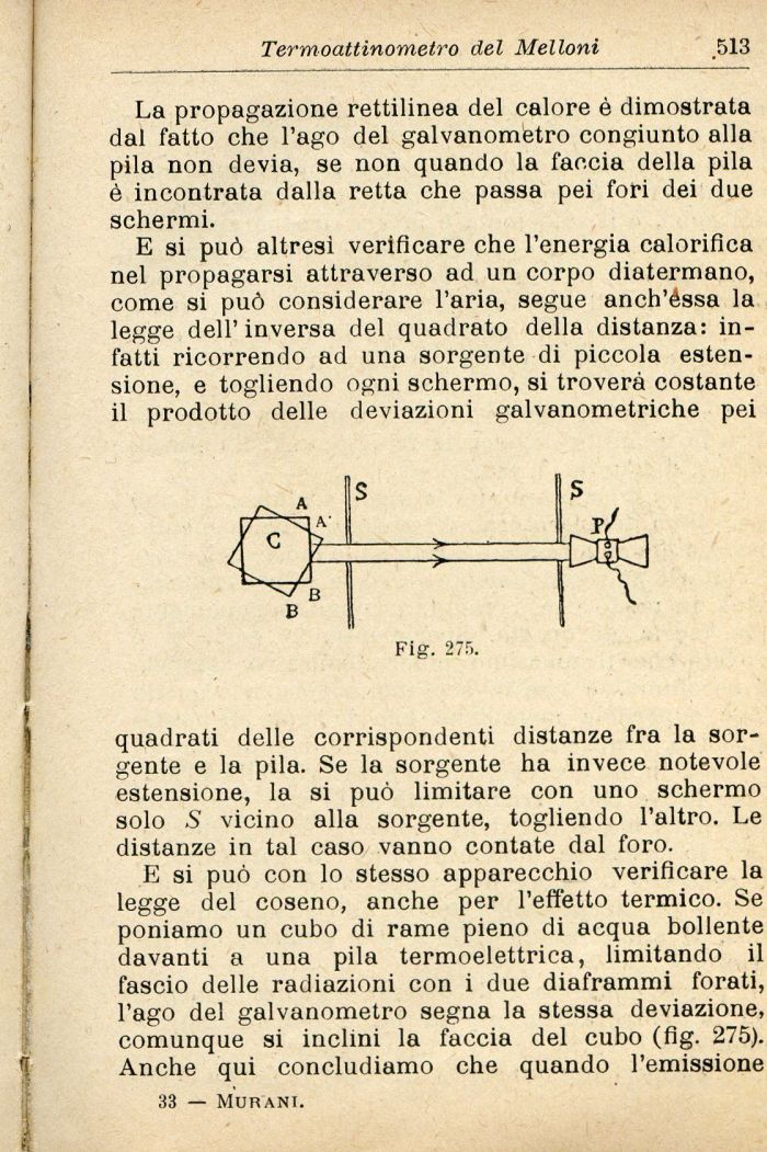 E si può con lo stesso apparecchio verificare la legge del coseno, anche per l'effetto termico. Se poniamo un cubo di rame pieno di acqua bollente davanti a una pila termoelettrica, limitando il fascio delle radiazioni con i due diaframmi forati, l'ago del galvanomètro segna la stessa deviazione, comunque si inclini la faccia del cubo (fig. 275). Anche qui concludiamo che quando l'emissione 33 — Murani.