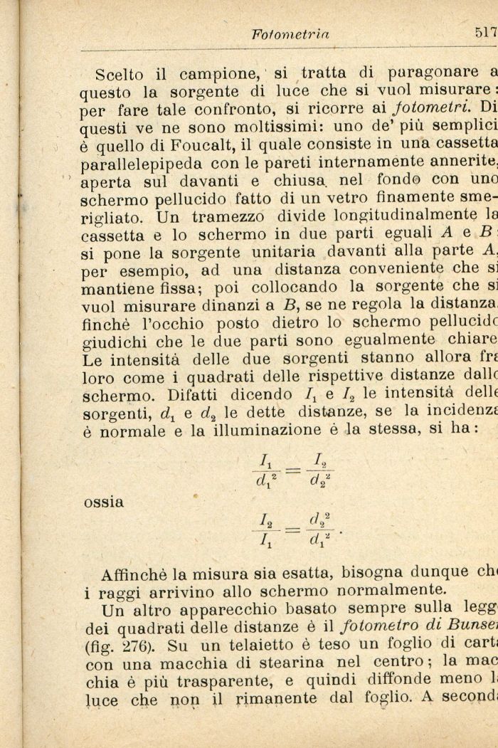 Scelto il campione, si tratta di paragonare a questo la sorgente di luce che si vuol misurare : per fare tale confronto, si ricorre ai fotometri. Di questi ve ne sono moltissimi: uno de' più semplici è quello di Foucalt, il quale consiste in una cassetta parallelepipeda con le pareti internamente annerite, aperta sul davanti e chiusa nel fondo con uno schermo pellucido fatto di un vetro finamente smerigliato. Un tramezzo divide longitudinalmente la cassetta e lo schermo in due parti eguali A e B si pone la sorgente unitaria davanti alla parte A, per esempio, ad una distanza conveniente che sì mantiene fissa; poi collocando la sorgente che si vuol misurare dinanzi a B, se ne regola la distanza finché l'occhio posto dietro lo schermo pellucide giudichi che le due parti sono egualmente chiare Le intensità delle due sorgenti stanno allora frt loro come i quadrati delle rispettive distanze dalle schermo. Difatti dicendo 7, e 72 le intensità delk sorgenti, dt e d2 le dette distanze, se la incidenzt è normale e la illuminazione è la stessa, si ha :