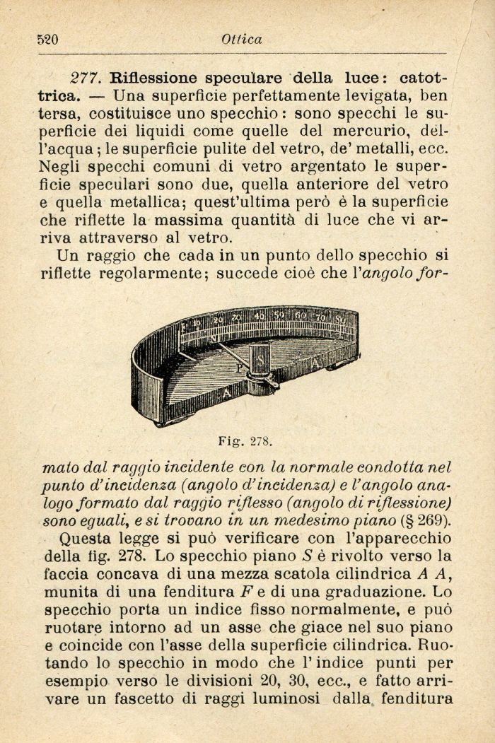 Questa legge si può verificare con l'apparecchio della Mg. 278. Lo specchio piano 5 è rivolto verso la faccia concava di una mezza scatola cilindrica A A, munita di una fenditura F e di una graduazione. Lo specchio porta un indice fisso normalmente, e può ruotare intorno ad un asse che giace nel suo piano e coincide con l'asse della superficie cilindrica. Ruotando lo specchio in modo che l'indice punti per esempio verso le divisioni 20, 30, ecc., e fatto arrivare un fascette di raggi luminosi dalla fenditura