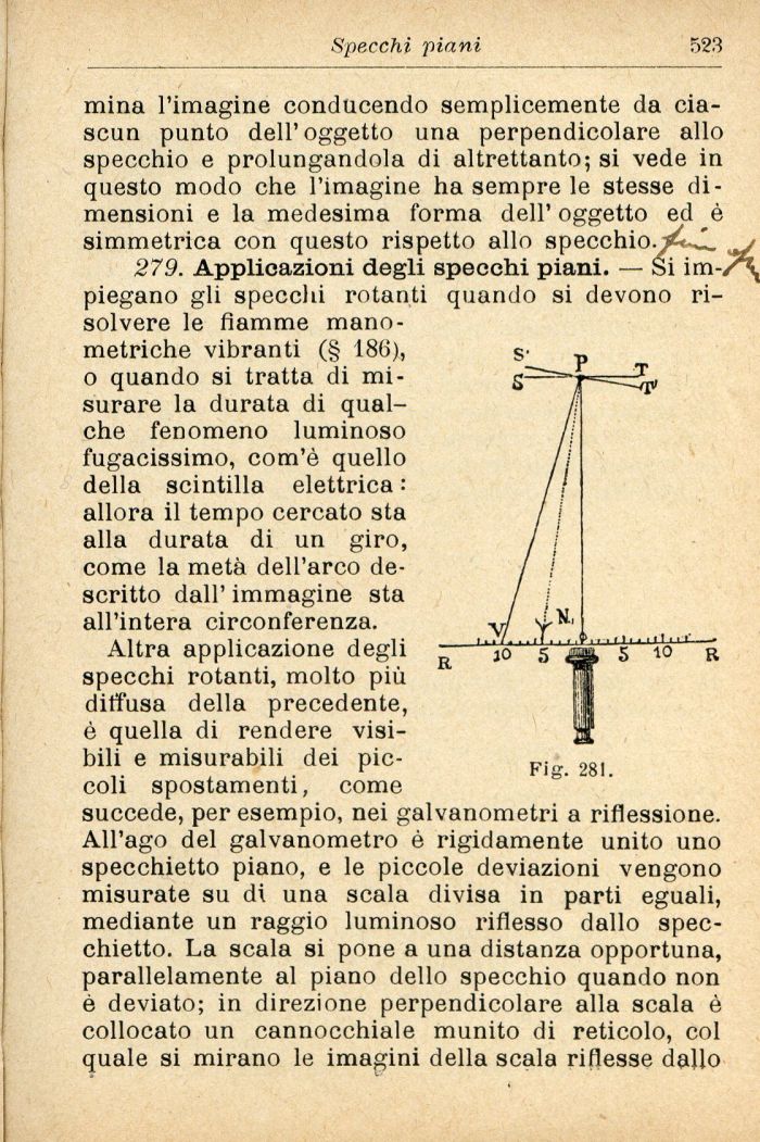 mina l'imagine conducendo semplicemente da ciascun punto dell'oggetto una perpendicolare allo specchio e prolungandola di altrettanto; si vede in questo modo che l'imagine ha sempre le stesse dimensioni e la medesima forma dell' oggetto ed è simmetrica con questo rispetto allo specchio.^* JL j 279. Applicazioni degli specchi piani. — Si im-/\ piegano gli specchi rotanti quando si devono risolvere le fiamme manometriche vibranti (§ 186), o quando si tratta di misurare la durata di qualche fenomeno luminoso fugacissimo, com'è quello della scintilla elettrica : allora il tempo cercato sta alla durata di un giro, come la metà dell'arco descritto dall' immagine sta all'intera circonferenza.