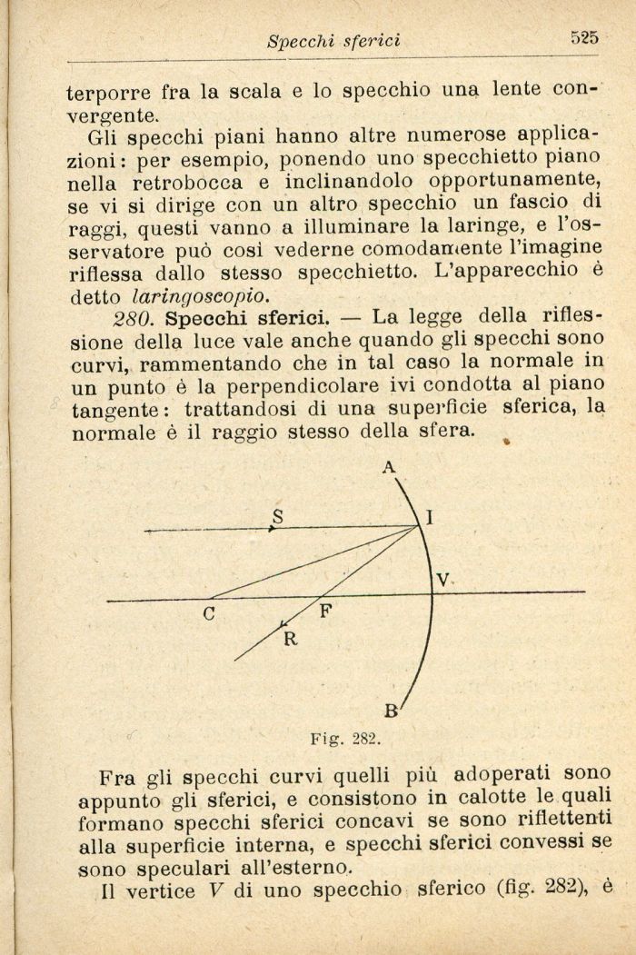 280. Specchi sferici. — La legge della riflessione della luce vale anche quando gli specchi sono curvi, rammentando che in tal caso la normale in un punto è la perpendicolare ivi condotta al piano tangente: trattandosi di una superfìcie sferica, la normale è il raggio stesso della sfera.