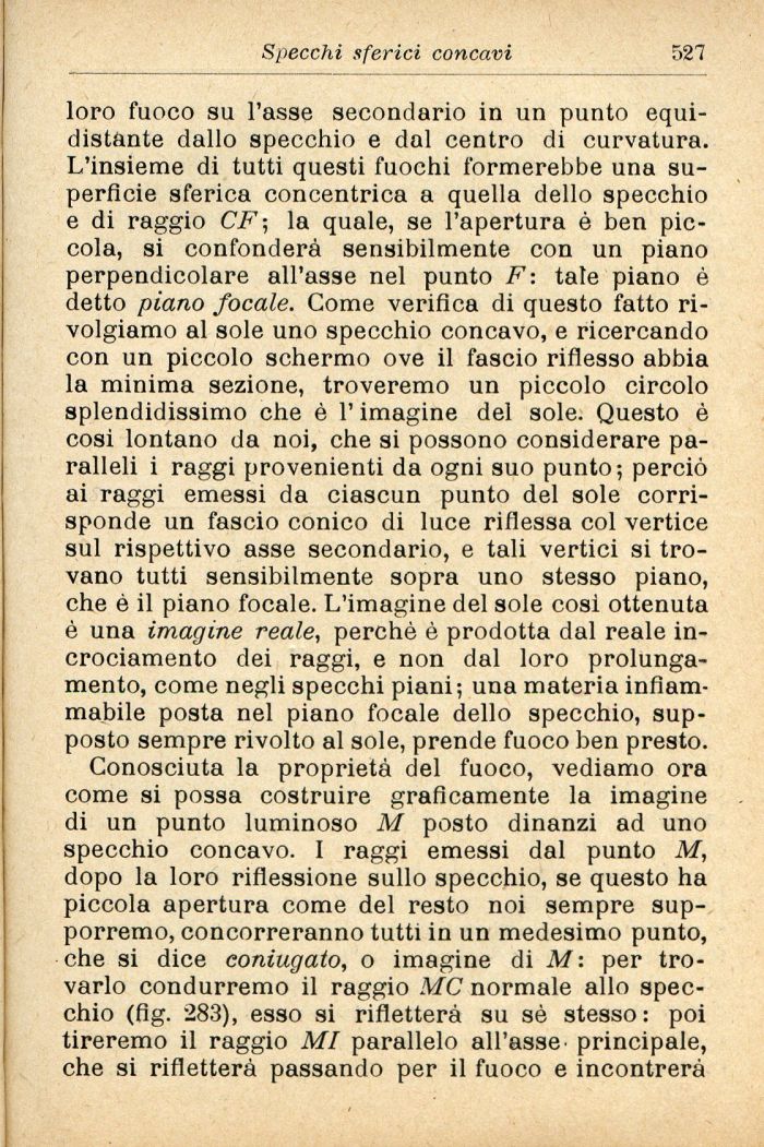 loro fuoco su l'asse secondario in un punto equidistante dallo specchio e dal centro di curvatura. L'insieme di tutti questi fuochi formerebbe una superficie sferica concentrica a quella dello specchio e di raggio CF-, la quale, se l'apertura č ben piccola, si confonderą sensibilmente con un piano perpendicolare all'asse nel punto F: tate piano č detto piano focale. Come verifica di questo fatto rivolgiamo al sole uno specchio concavo, e ricercando con un piccolo schermo ove il fascio riflesso abbia la minima sezione, troveremo un piccolo circolo splendidissimo che č l'imagine del sole. Questo č cosi lontano da noi, che si possono considerare paralleli i raggi provenienti da ogni suo punto; perciņ ai raggi emessi da ciascun punto del sole corrisponde un fascio conico di luce riflessa col vertice sul rispettivo asse secondario, e tali vertici si trovano tutti sensibilmente sopra uno stesso piano, che č il piano focale. L'imagine del sole cosi ottenuta č una imagine reale, perchč č prodotta dal reale incrociamento dei raggi, e non dal loro prolungamento, come negli specchi piani; una materia infiammabile posta nel piano focale dello specchio, supposto sempre rivolto al sole, prende fuoco ben presto.