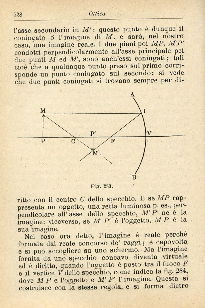 Nel caso ora detto, l'imagine è reale perchè formata dal reale concorso de' raggi ; è capovolta e si può accogliere su uno schermo. Ma l'imagine fornita da uno specchio concavo diventa virtuale ed è diritta, quando l'oggetto è posto tra il fuoco F e il vertice V dello specchio, come indica la flg. 284, dove M P è l'oggetto e M' P' l'imagine. Questa si costruisce con la stessa regola, e si forma dietro